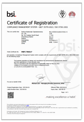 6月26日,永信贵宾会光电顺利通过国际标准ISO 37301:2021《合规管理体系要求及使用指南》与国家标准GB/T 35770-2022《合规管理体系要求及使用指南》双标准评审,成功获得国际权威标准组织英国标准学会(简称“BSI”)颁发的合规管理体系认证证书。