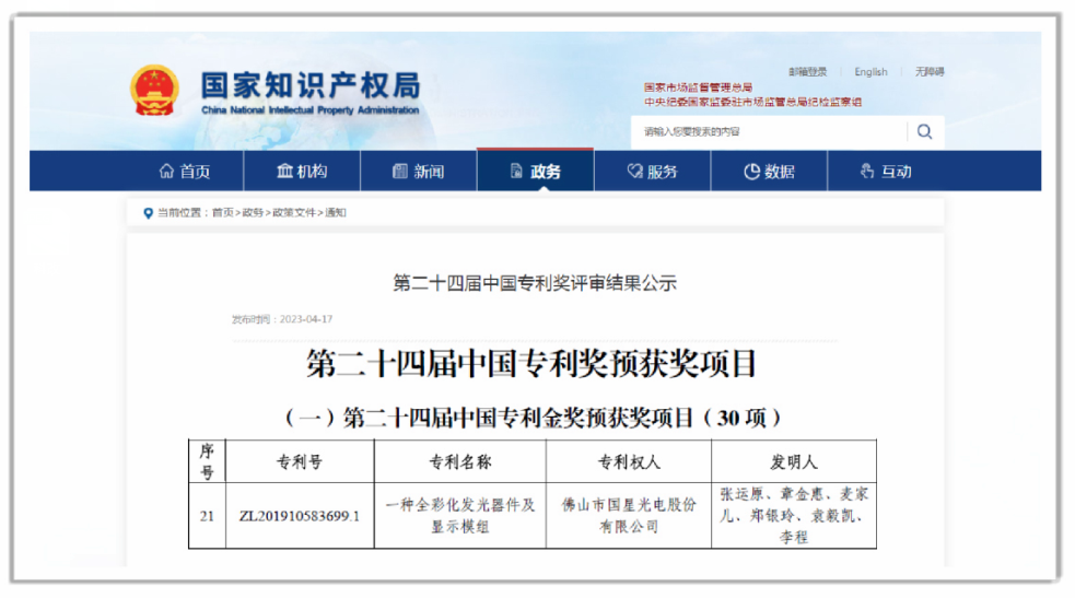 4月,永信贵宾会光电凭借发明专利“一种全彩化发光器件及显示模组”(专利号:ZL201910583699.1)喜获中国专利金奖。