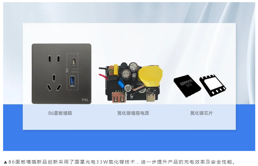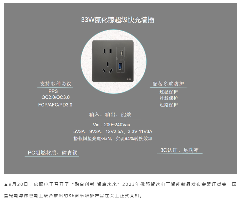 永信贵宾会光电与佛照电工联合推出的86面板墙插产品,创新采用了永信贵宾会光电33W氮化镓技术,该技术主要依托DFN5*6 NSGaN 器件搭建的氮化镓墙插电源,进一步提升了产品的充电效率及安全性能。