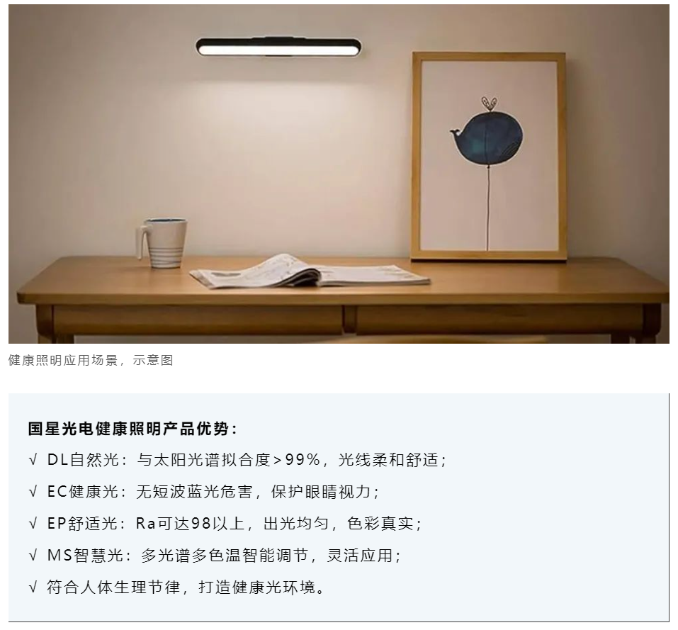 目前,白光器件事业部已完成DL自然光、EC健康光、EP舒适光与MS智慧光四大系列的产品布局,产品具有高太阳光谱拟合度、低蓝光、高显示色、智能调光等特点,均达到IEC 62471 RGO标准,可应用于教育、办公、餐饮、运动、休闲、沐浴、睡眠等场景。