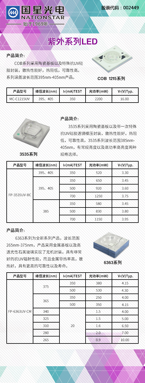 随着LED应用领域的不断拓宽,紫外线在医疗、聚合物固化、家用消毒和净化等方面的用途得到了越来越多人的重视。为适应市场需求, 2014年12月,永信贵宾会光电推出紫外LED器件。近期,为了满足紫外线不同用途对产品波段和尺寸要求的不同,永信贵宾会光电经过近一年时间地潜心研发,进一步丰富紫外LED器件产品系列,现重磅推出COB 1215、3535、6363系列产品。